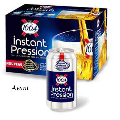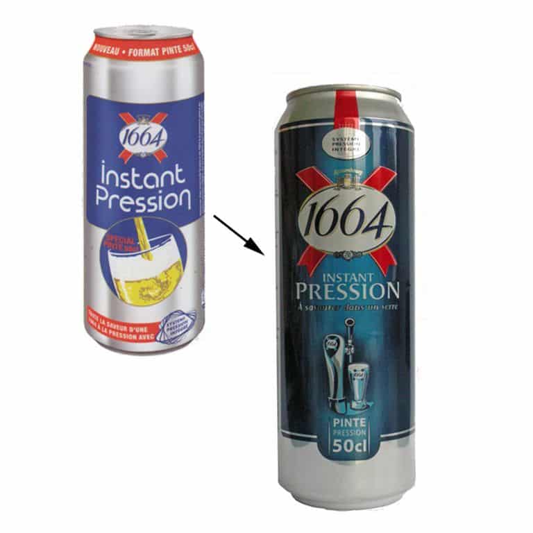 Mieux, la marque vient de revoir son packaging. Objectif : s’adapter à l’évolution graphique générale de 1664, mais également mieux véhiculer le concept de bière à la pression. Le mot « pression » est davantage mis en avant. Sur le format 50 cl comme sur le suremballage carton de la boîte 33 cl où la surface d’expression est supérieure, le bec pression de la marque, à la forme reconnaissable, est dessiné aux côtés d’un verre. La mention « pinte pression 50 cl » apparaît clairement sur la grande boîte, ce qui marque une nouveauté. En effet, compte tenu de la présence du widget, auparavant la boîte d’une capacité de 50 cl ne contenait réellement que 44 cl de bière. Désormais afin d’en proposer 50 cl, un véritable demi, la canette affiche un volume de 56,8 cl.