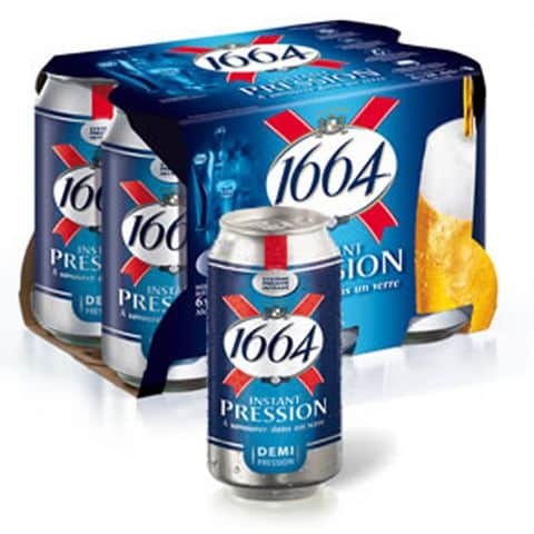 Pour ce qui est du petit modèle arborant simplement la mention « demi pression », s’il s’agit bien d’une boîte 33 cl, elle ne contient que 28 cl de bière. Soit un peu plus qu’un traditionnel demi au bar (25 cl). Toujours pour offrir la meilleure expérience possible à ses consommateurs, 1664 a ajouté l’expression « à savourer dans un verre » sur l’ensemble de ses emballages. Enfin, le pack de regroupement 6 x 28 cl n’est plus une caisse carton fermé mais un cavalier laissant davantage voir les canettes.