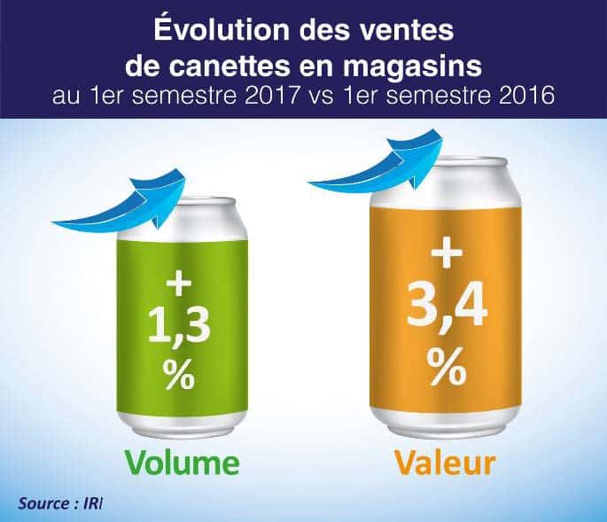 Sur un marché dynamisé par la généralisation du nouveau format « slim » (ou « sleek ») plus allongé et plus fin, les canettes de soft drinks gagnent des parts de marché au 1er semestre 2017, par rapport au 1er semestre 2016. Les canettes représentent ainsi 18,4% des soft drinks vendus vs 18,2% l’an passé. En effet, les ventes de soft drinks en canettes ont progressé de +2,2% en volume, sur un marché des soft à +1,2%. Une croissance notamment due aux très belles performances de la canette sur les boissons gazeuses aux fruits, où elle progresse de +12% vs +1% pour le segment ; sur les thés glacés, avec une hausse de +23% pour la canette vs +15% pour le segment ; ou encore sur les « limes », avec +17% vs +5%.