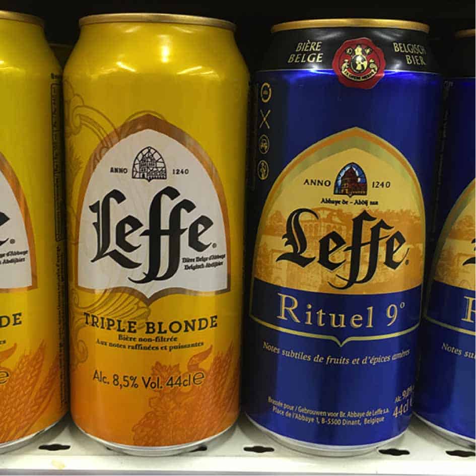Après la blonde, la brune, la Ruby, voici la Rituel et la Triple. Avec des teneurs alcooliques supérieures au références classiques, elles titrent respectivement 9 et 8,5° contre 6,6° pour la blonde par exemple, ces deux nouveautés entendent se positionner davantage sur le segment de la dégustation (d’où le nom ”Rituel ») que sur celui des bières fortes à proprement parler. Ce qui explique le choix d’un format de canette différenciant, légèrement inférieur au traditionnel demi-litre : 44 cl. Aux côtés des boîtes existantes, la dorée pour la blonde, la marron pour la brune et la rouge pour la Ruby, ces deux nouvelles canettes se distinguent par leur code couleur : bleu pour la Rituel et jaune pour la Triple. Ce faisant, le leader des bières d’abbaye s’impose dans le linéaires des boîtes avec l’offre de loin la plus large. Son challenger, Grimbergen (Kronenbourg) ne dispose en effet que de deux références en boîte 50 cl, la blonde et la rouge, bien qu’il dispose d’une offre de 9 variétés en bouteilles.