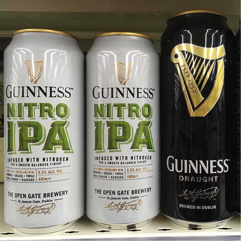 Deux marques étrangères célèbres s’y mettent : Guinness et 8.6 by Bavaria. Brassée à partir de cinq houblons différents, la Guinness Nitro IPA titre 5,8 % d’alcool et est conditionnée dans une canette de 44 cl (format classique outre-Manche).