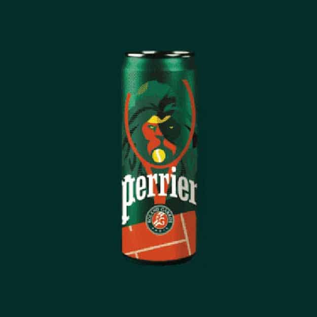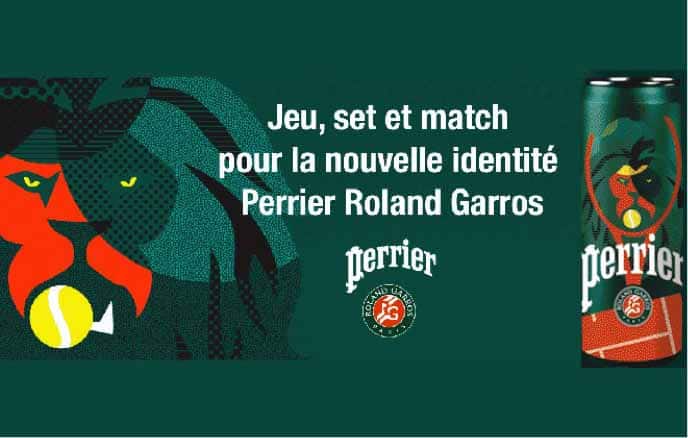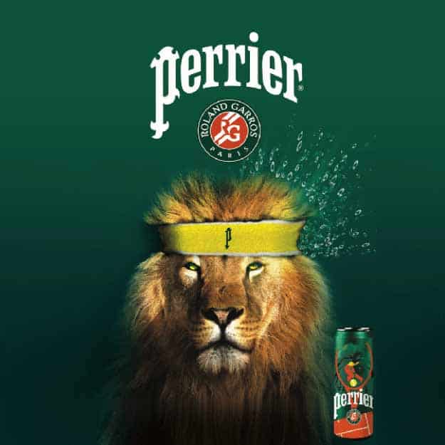 Pour l’occasion, la marque a entièrement renouvelé sa plateforme graphique mettant la tête du lion emblématique avec une raquette de tennis au centre des packagings. Le tout sur un fond vert commun à Perrier et au tournoi, ainsi que sur le bas du visuel, l’illustration de la mythique terre battue et de ses lignes blanches. Jeu, set et match pour Perrier !
