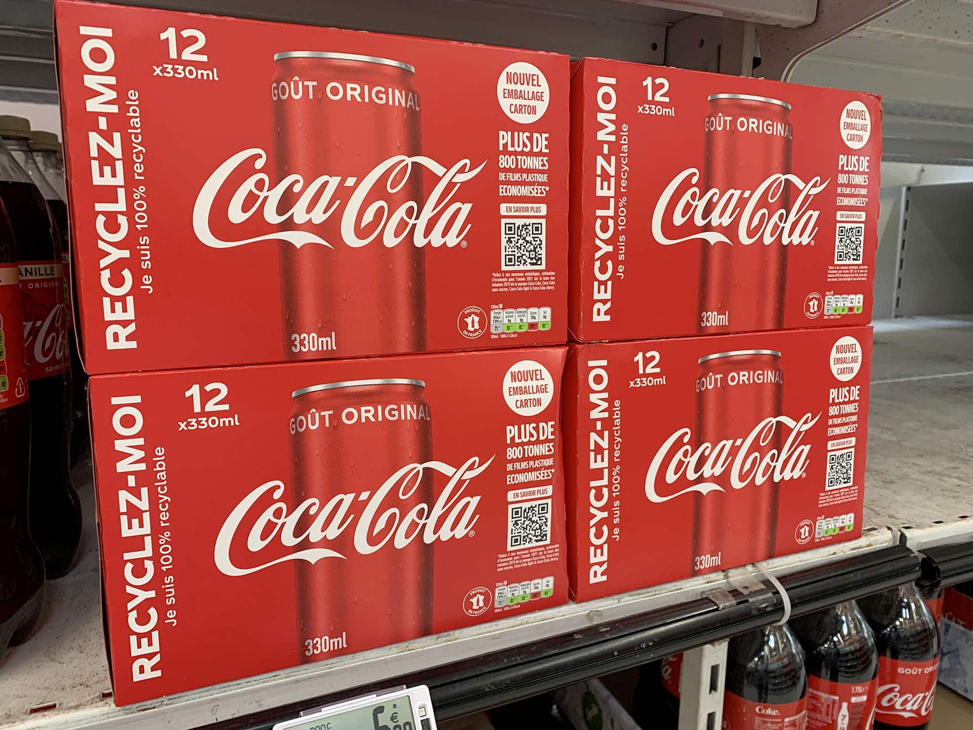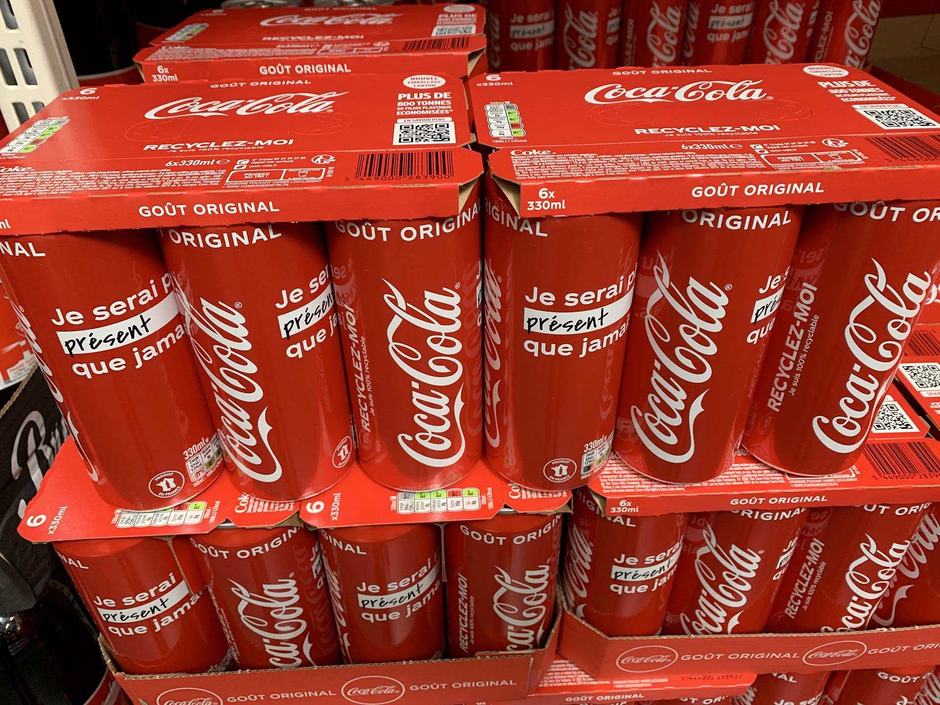 Cette initiative très axée “développement durable“ s’accompagne d’une communication renforcée sur les différents packagings de leurs qualités environnementales. La mention “Recyclez moi, je suis 100 % recyclable“ est ainsi désormais inscrite sur les packs carton et sur les canettes. Parallèlement, sur certains packs Coca-Cola précise l’économie de plastique avec le passage au carton : “Plus de 800 tonnes” ! Un QR code invite aussi les consommateurs à en savoir plus sur les pratiques de la marque en matière de recyclage et d’environnement.