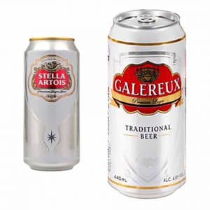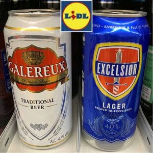 Au rayon bières, Lidl joue à son tour la carte “me-too“ avec sa référence Galereux, lager de 4,8°, dont le packaging est une copie explicite de la bière belge Stella Artois renommée au Royaume Uni : canette 44 cl avec fond blanc et bloc marque rouge et or. Par contre nul producteur belge derrière ce produit, mais la brasserie française de Champigneulle. Celle-ci brasse également l’autre lager de Lidl proposée aussi en format 44 cl : Exelsior 4°. Autre point commun entre ces deux produits : la mention “Suitable for vegetarians and vegans“ au dos de la boîte.