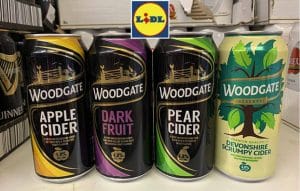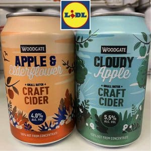 Autre produit très consommé au Royaume Uni, le cider a droit chez Lidl à pas moins de 6 références en boîtes fédérées sous la marque Woodgate. Trois boîtes 44 cl ciblent clairement la marque leader, Strongbow, avec un packaging sur fond noir illustré en doré : un cider classique à 5°, un aromatisé “dark fruit“ 4° et un poiré 4,8°. Vient s’ajouter une 4ème canette 44 cl de cider de terroir (Devonshire Scrumpy Cider 6°) et deux “craft cider“ en 33 cl. Un cider “cloudy“ ou trouble à 5,5° et un aromatisé au sureau à 4°. Si les packagings des produits typés “production industrielle“ arborent des vernis brillants, les produits “craft“ se distingue avec un aspect mat. Et, ce, aussi bien en cider, qu’en bière.