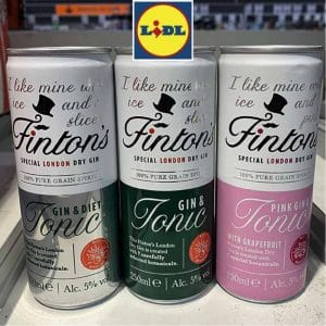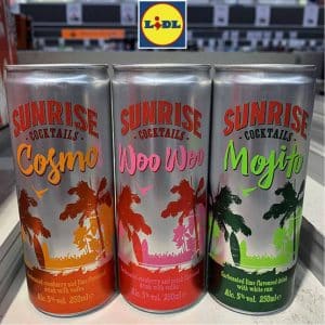 Last but not least, Lidl dispose de quelques boîtes au rayon alcools. Autorisé outre-Manche, le segment des premix est habituellement le terrain de jeu des grandes marques du rayon alcools (Gordons, Jack Daniel’s, Captain Morgan, Smirnoff…). Lidl leur préfère évidemment ses propres signatures. C’est ainsi que le gin “maison“ Finton’s décline trois références en canettes slim 25 cl : un gin & tonic, un gin & diet tonic (sans sucre) et un pink gin & tonic à base de gin rosé. Enfin, dans un même format, trois recettes de cocktails à 5° viennent s’ajouter sous la marque Sunrise : Mojito (rhum et citron vert), Cosmo (vodka, cranberry et citron vert) et Woo Woo (vodka, cranberry et pêche).