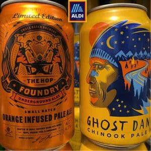 Surfant sur la vague des bières artisanales, particulièrement celles conditionnées en boîte métallique, Aldi propose deux pale ales en 33 cl. Une d’influence franchement nord-américaine, Ghost Dance, décorée d’une tête d’indien. L’autre d’origine moins affirmée mais jouant davantage sur le travail du houblon (en anglais “hop”) avec la signature Hop Foundry et une recette à l’orange.