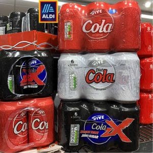 Au rayon des soft-drinks, l’assortiment cola d’Aldi sort du lot avec trois recettes en canettes (pack 6×33 cl filmés) sous la marque “maison” Vive : un cola original, un diet cola et un cola ZX pour Zero Sugar, Xtreme Taste. Si les deux premières références s’inspirent de la marque Coca-Cola, la troisième revendique clairement l’influence de Pepsi Max avec un bloc marque bleu sur fond noir et la signature ZX en rouge rappelant le “Max”. Une preuve supplémentaire que les discounters sont de moins en moins “hard”, démultipliant le nombre de références pour un besoin produit donné.