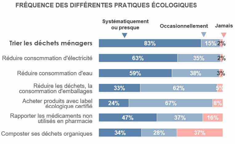 Le tri est, de loin, la pratique écologique la plus appliquée avec assiduité par les Français. Le tri des déchets ménagers concerne ainsi la quasi-totalité de la population : 98 % disent le pratiquer. Une majorité d’entre eux, 83%, déclarent trier leurs déchets de façon systématique ou presque et 15 % occasionnellement. Ils sont seulement 2 % à ne jamais les trier.