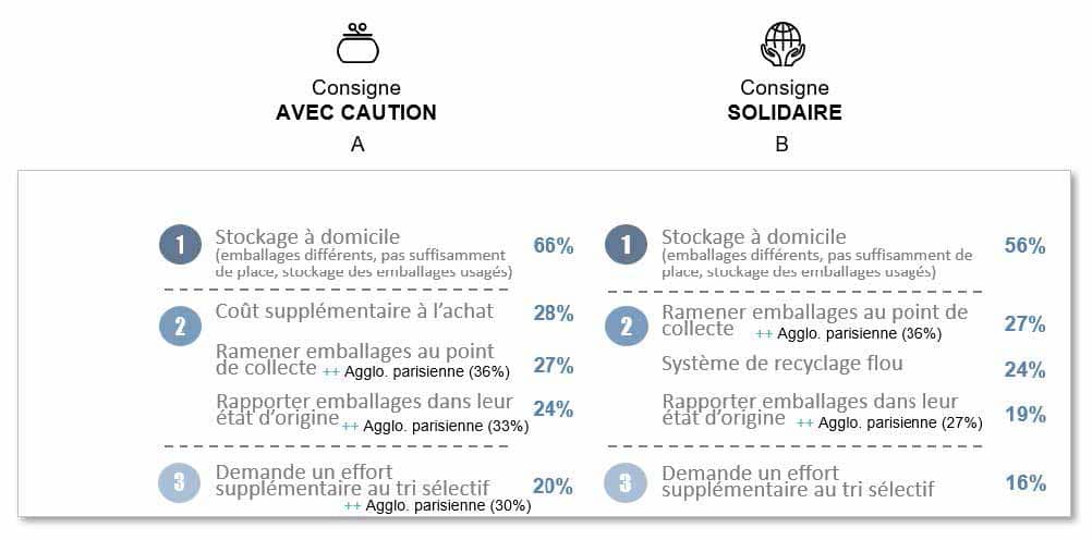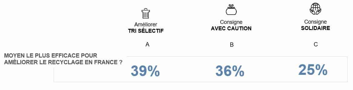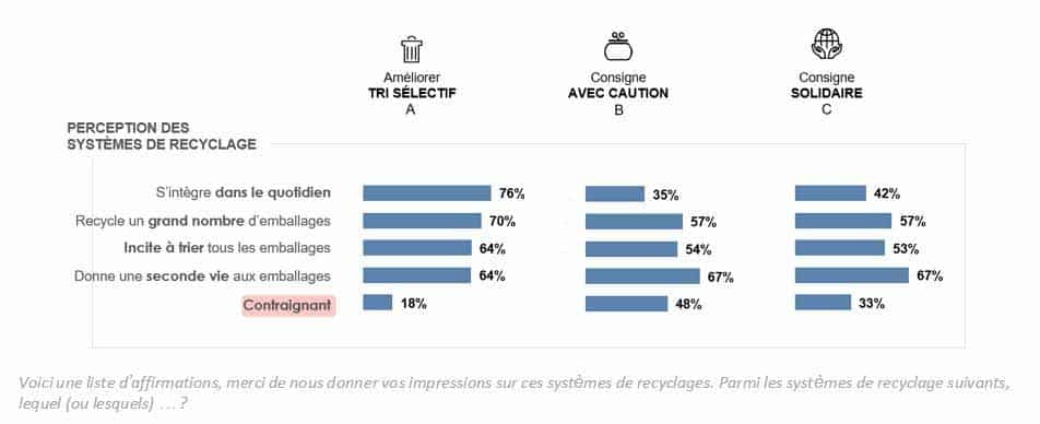 Dans une large majorité (85 %), les Français s’accordent à dire que la consigne est un système de collecte qui permet de mieux recycler les emballages.Stockage et coût : les deux principaux freins à la consigne