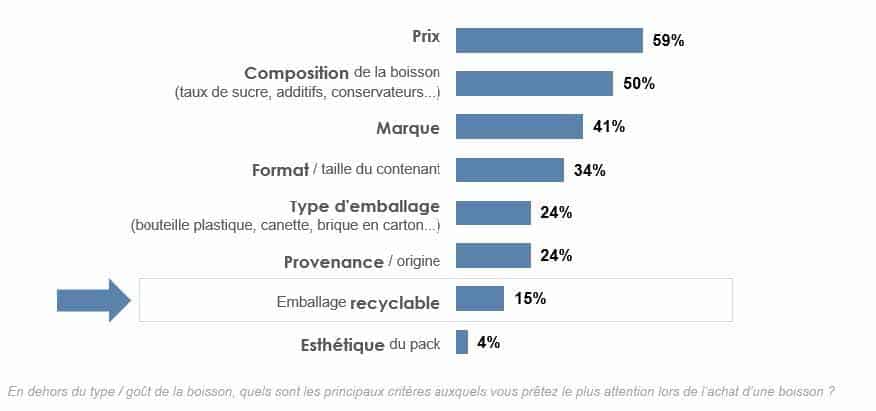 Lorsque les Français achètent une boisson, hormis les critères liés à son type et à son goût, ils s’attachent en tout premier lieu à son coût d’achat. 59 % des Français disent en effet prêter attention à son prix, devant la composition (50 %) ou encore la marque (41 %). La recyclabilité de l’emballage n’est citée que par 15 % des consommateurs de boisson.