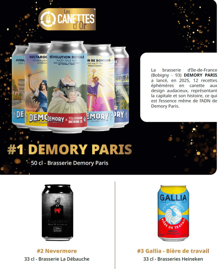 La 5e Cérémonie des Canettes d’Or, organisée par La Boîte Boisson à Paris, a récompensé les plus belles canettes et initiatives en faveur du recyclage — et la brasserie Demory Paris s’est distinguée en remportant la Canette d’Or du design Bières (challenger). Implantée à Bobigny (93), la brasserie d’Île‑de‑France a signé en 2025 une opération ambitieuse et résolument artistique : 12 recettes éphémères en canette, portées par des visuels audacieux qui racontent Paris et son histoire.