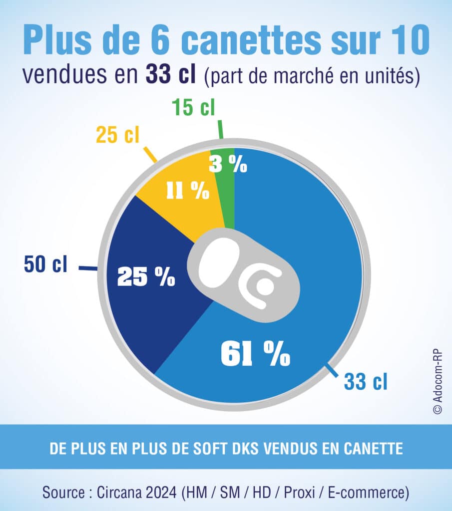 En 2024, leurs ventes ont progressé de +2,9 % en magasins, sur un marché en baisse de -2,8 % vs 2023. Désormais, plus de 1 soft-drink sur 5 (25,6 %) est vendu en canette, soit +1,6 pt vs 2023 et + 5,7 pts depuis 2019, année de référence pré-covid.