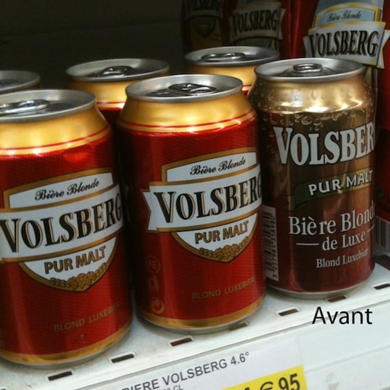 Au rayon bières, positionnée jusque là en premier prix (à droite sur la photo), la marque Volsberg arbore désormais un nouveau packaging pour sa boîte 33 cl (à gauche) rivalisant davantage avec les grandes marques du segment.