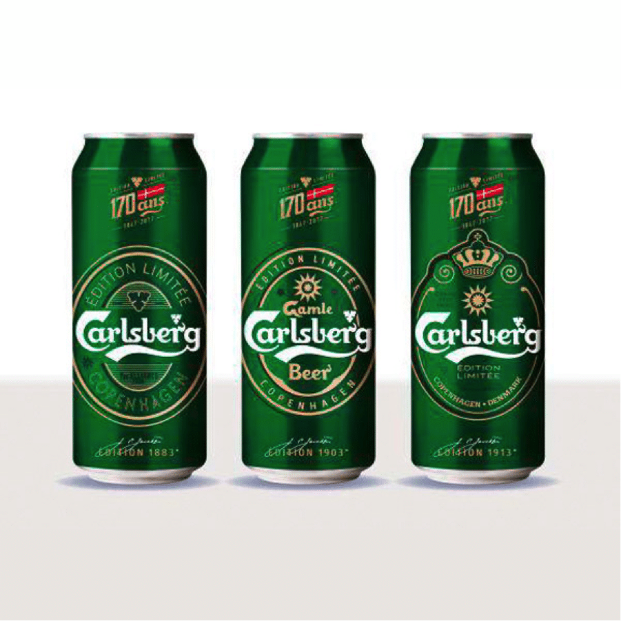 A cette occasion, la marque danoise ressort de ses cartons des décors emblématiques de son histoire, représentatifs de trois périodes : 1883, 1903 et 1913. La boîte 50 cl déclinera ses 3 designs collectors. L’année 1883 fait référence à la découverte de la levure Saccharomyces Carlsbergensis dans le laboratoire de la brasserie. En 1903, Carlsberg est devenu  fournisseur officiel de la Cour Royale du Danemark. Enfin, en 1913, pour marquer son attachement à sa patrie, le Danemark, Carl Jacobsen commande une sculpture qu’il offrira bientôt à Copenhague : La Petite Sirène.
