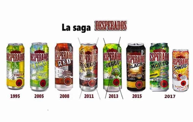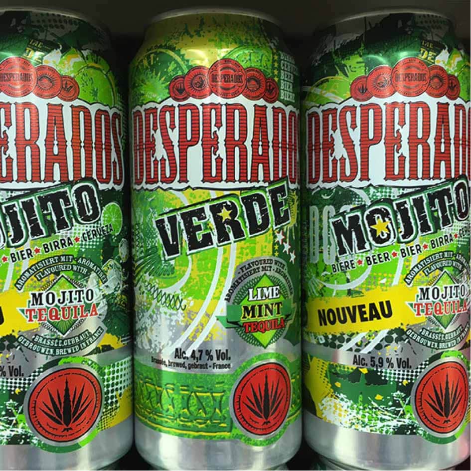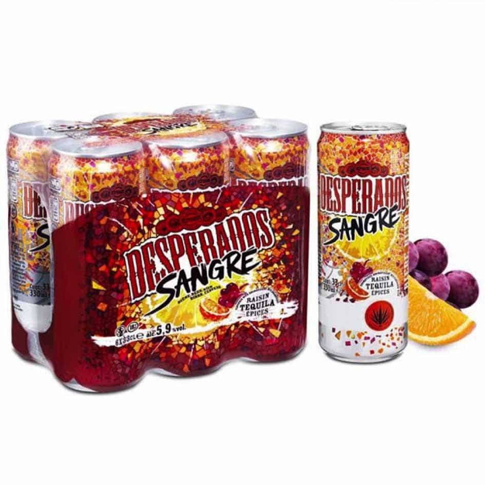 Propriété de Brasseries Heineken, Despérados est née voici 22 ans. Si elle n’a pas initié le segment des bières aromatisées, sa grande sœur au whisky Adelscott étant apparue 10 ans plus tôt, Despé l’a fait émerger. Depuis de nombreuses marques lui ont emboîté le pas, comme récemment Skøll et Cubanisto. Mono-recette pendant 12 ans, jusqu’en 2005 avec le lancement de la version Màs devenue depuis Lime, Despé signe désormais une gamme de de 6 saveurs différentes. Deux sont apparues l’an dernier. La Mojito a remplacé la déclinaison Verde qui surfait déjà sur la vague du célèbre cocktail mêlant lime et menthe, mais sans en avoir le nom. Le design a été revu et la recette adaptée, passant notamment de 4,7 à 5,9°. Quant à la Despé Sangre, celle-ci fait référence à l’esprit de la « sangria », boisson latino s’il en est. Pour le lancement de la Sangre, Heineken a opté pour une canette slim 33 cl vendue en pack de 6 filmé.