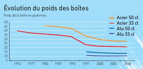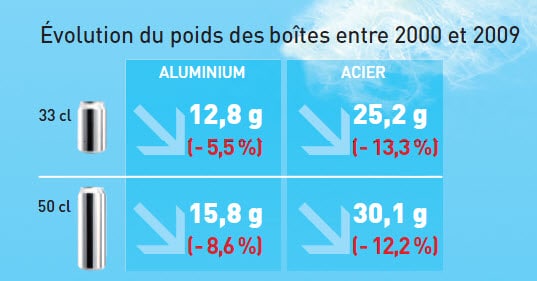 Depuis 1969 le poids d’une canette 35,5 cl a été réduit d’environ 40 %. Ramenée aux milliards de boîtes produites chaque année, l’économie est plus que conséquente.