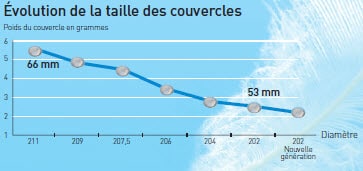 Les canmakers n’ont eu de cesse d’économiser du métal en réduisant l’épaisseur et la surface du métal utilisé pour le corps, mais aussi en diminuant progressivement la taille du couvercle. En Europe, l’évolution s’est faite du diamètre 209 (2 pouces et 9/16e), au 206 et enfin au 202.