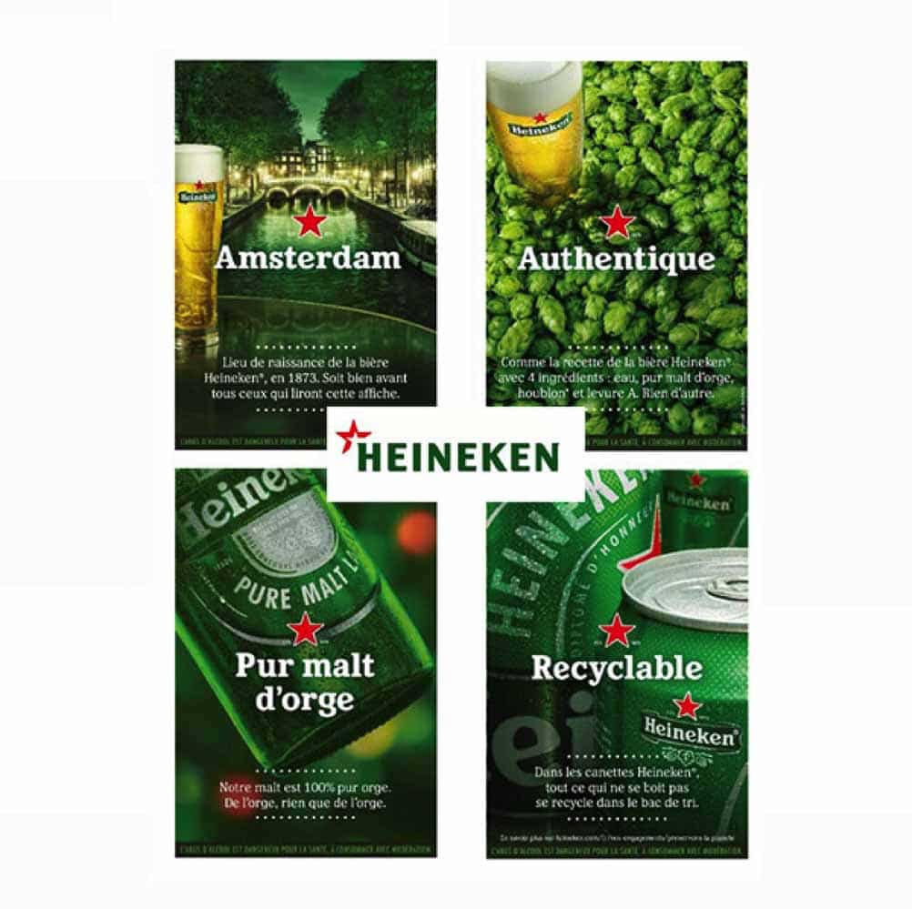 L’un des visuels revient sur la naissance de la bière en 1873 à Amsterdam, un autre parle de sa recette authentique composée exclusivement de quatre ingrédients d’origine naturelle (levure, houblon, eau et malt d’orge), un troisième évoque l’origine française de son malt 100 % pur orge. Enfin, la préoccupation environnementale est au cœur du 4ème visuel. Pour l’illustrer : la canette et sa recyclabilité. « Dans les canettes Heineken, tout ce qui ne se boit pas se recycle dans le bac de tri », est-il précisé sur un ton humoristique. Ce faisant, Heineken poursuit sa politique d’incitation au tri. Une démarche déjà salué avec l’ajout du logo « métal recyclable à l’infini » sur ses canettes.
