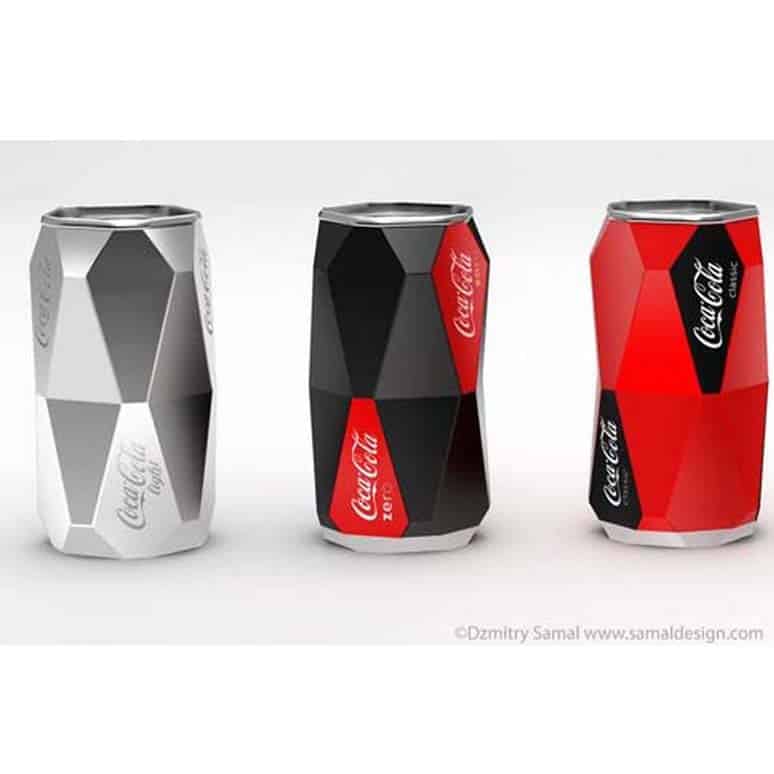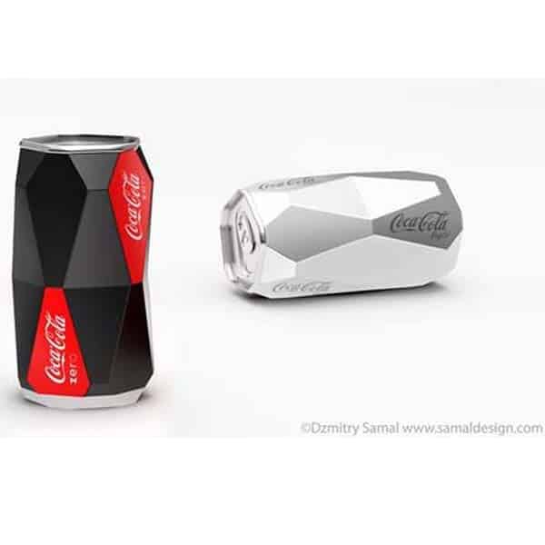 L’un d’entre-eux, le biélorusse Dzmitry Samal (son site ici) a imaginé un concept de canette dont la section serait pentagonale et les parois composées d’une multitude de facettes. Ceci confère à la boîte un aspect très futuriste. Seul bémol : le logo de la marque, habituellement très impactant puisqu’affiché sur toute la hauteur de la canette, s’inscrit ici en petit à l’intérieur de certaines facettes.