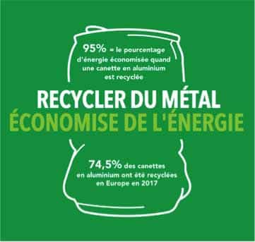Grâce aux filières de recyclage présentes en France, lorsqu’une canette est triée, il faut moins de 60 jours pour qu’elle soit recyclée sous la forme d’une nouvelle canette ou d’un autre produit en aluminium[4].