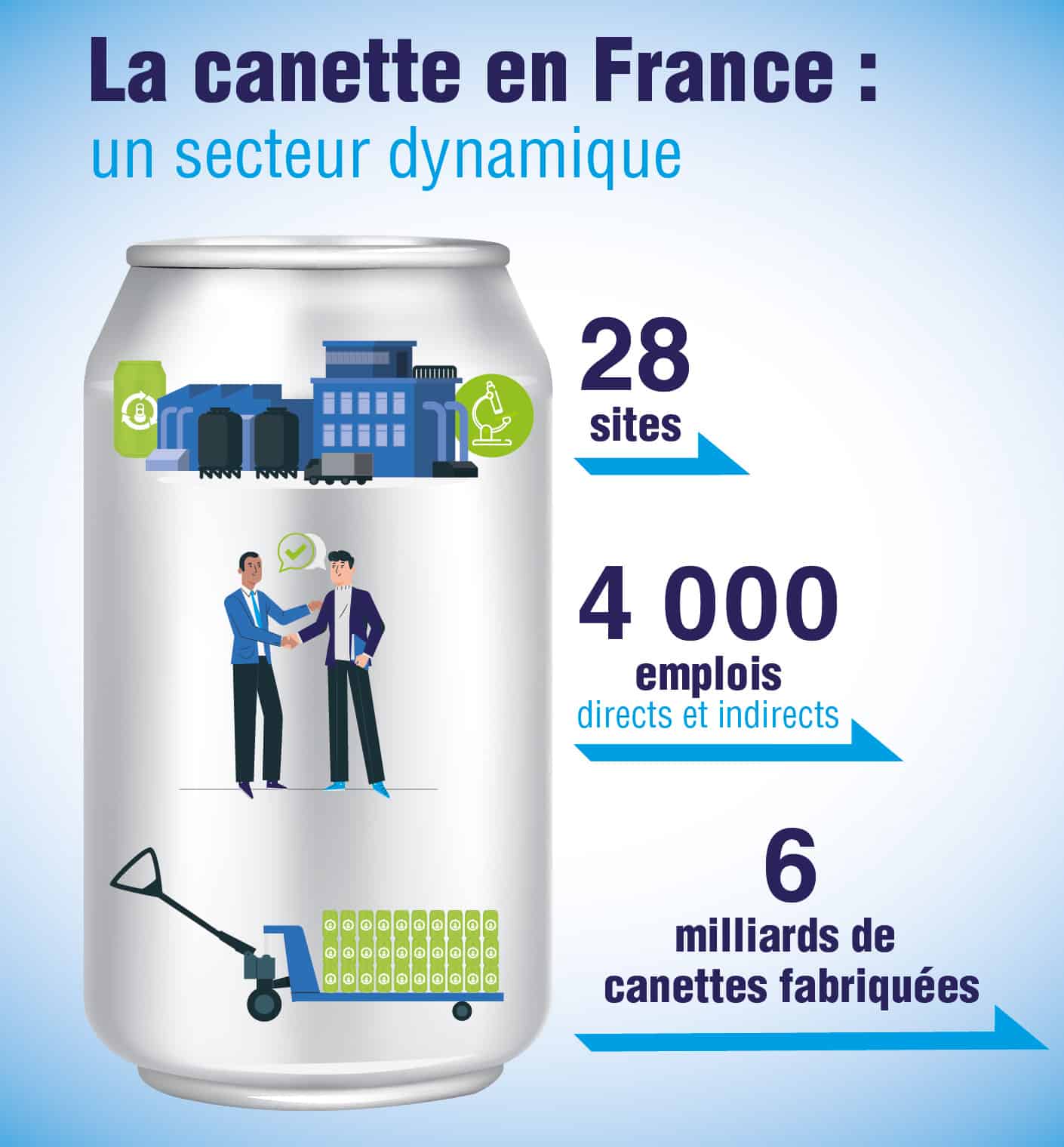 En France, la filière des canettes compte 28 usines et centres de Recherche et Développement sur tout le territoire. Elle représente 1 000 emplois directs, répartis dans toute la France et