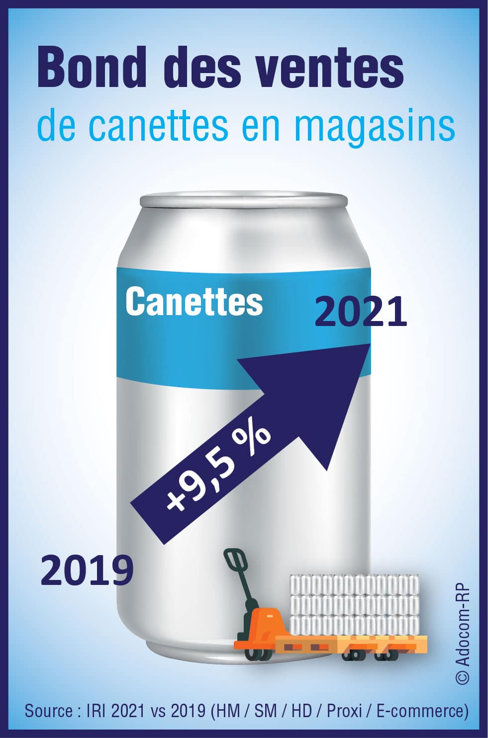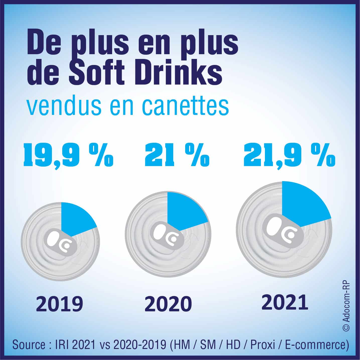 En 2 ans, la part des canettes dans les ventes de soft-drinks en magasins a gagné 2 points, de 19,9 % en 2019 à 21,9 % en volume aujourd’hui : une part historique.