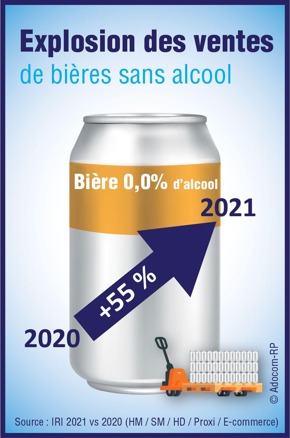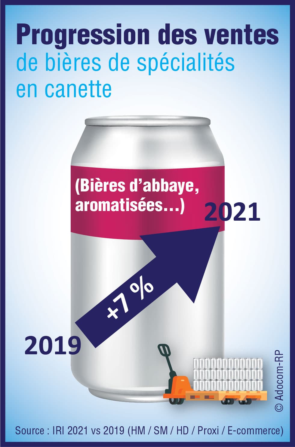 En revanche, les ventes de canettes de bière explosent sur les bières sans alcool, avec +55 % de ventes en volume entre 2020 et 2021 et poursuivent leur progression sur les bières de spécialités (bières d’abbaye, de toutes les bières aromatisées…) : +5,4 % en volume entre 2020 et 2021 et +7% entre 2019 et 2021.