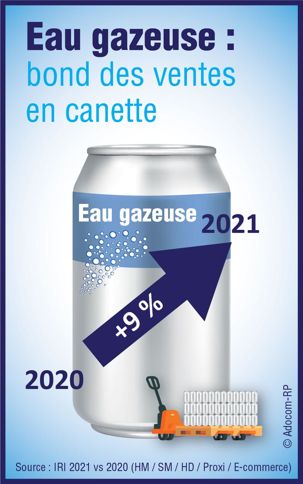 Les ventes d’eau en canette s’accélèrent en 2021 grâce aux nombreuses innovations des marques et lancements de produits qui ont inondé les rayons cette année. Les ventes d’eau aromatisées en canette enregistrent ainsi une hausse de +6% en volume, sur un marché global à +2%. Les eaux gazeuses en canette font quant à elle un bond de +9% en volume, sur un marché global à -6% !