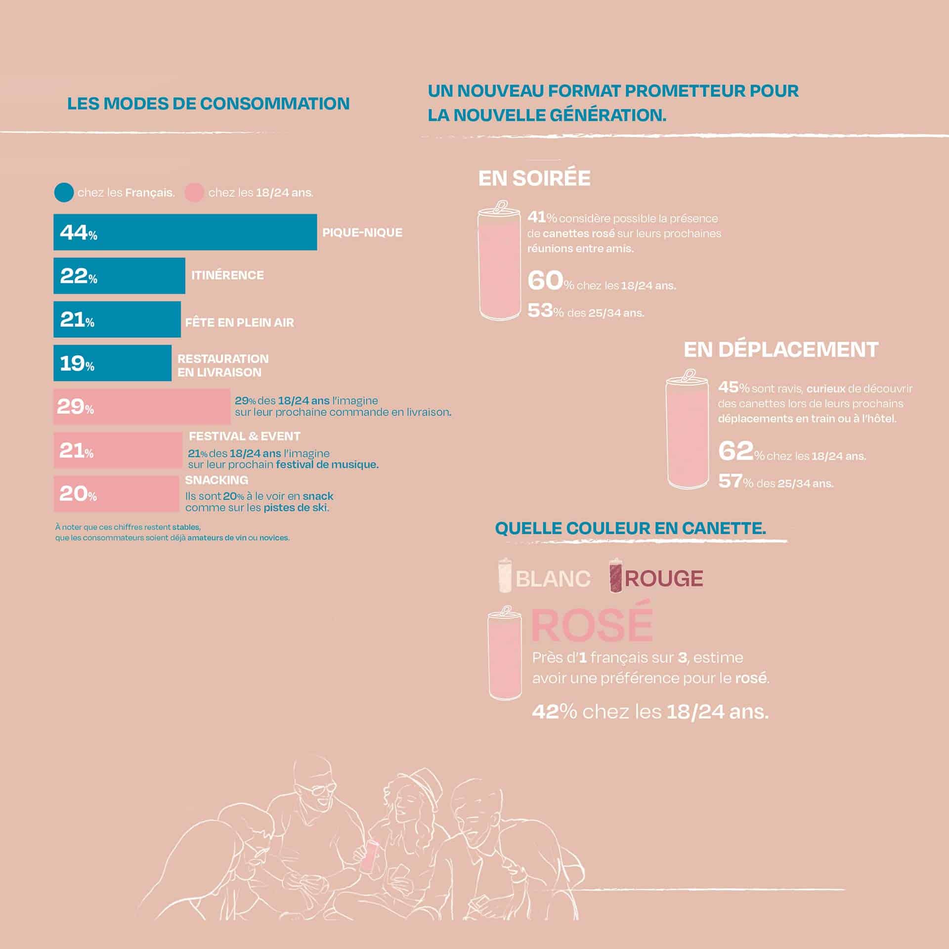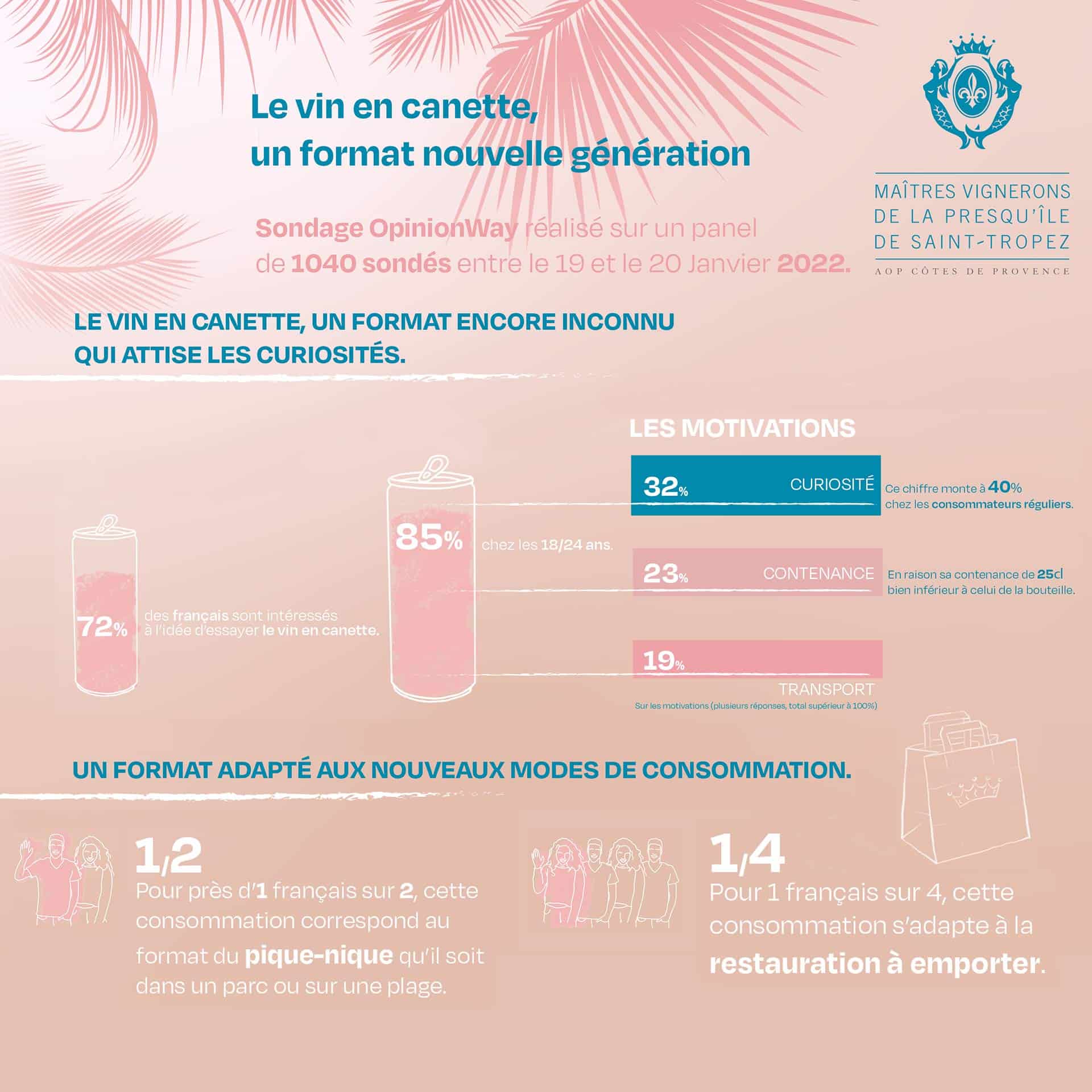72% des personnes interrogées sont intéressées et cette proportion grimpe à 85 % chez mes 18/24 ans. Quant aux motivations, la simple curiosité ressort en premier avec une proportion de 32 des sondés (40% chez les consommateurs réguliers). Vient ensuite la contenance de 25 cl pour 23% d’entre-eux et le transport pour 19%. En termes de moments et de lieux de consommation, pour près d’un Français sur deux, ce conditionnement est parfaitement adapté à un pique-nique. Et un sur quatre, l’associe spontanément à la restauration à emporter. autre chiffre intéressant tiré de cette étude : près d’un sondé sur trois plébiscite la couleur rosé pour un vin en canette devant le blanc et le rouge (42% chez les 18/24 ans).