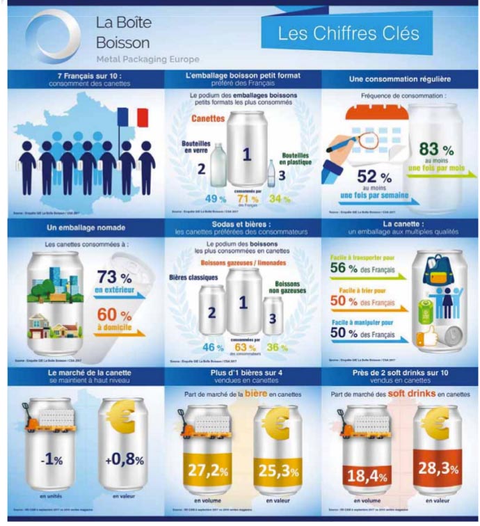 En France, la filière remplit chaque année environ 5 milliards de canettes. Elle représente 1 000 emplois directs répartis dans 28 usines et centres de Recherche et Développement sur tout le territoire. Très dynamique, elle a consacré 250 millions d’euros aux investissements ces dernières années. À l’écoute du marché, les fabricants font preuve d’une grande capacité d’innovation pour ancrer la canette au cœur de l’actualité et développer l’expérience des consommateurs en utilisant la surface d’expression exceptionnelle que représente ce support. Ils développent ainsi des encres fluorescentes, des textures rugueuses ou satinées, font la part belle aux QR codes pour renforcer les