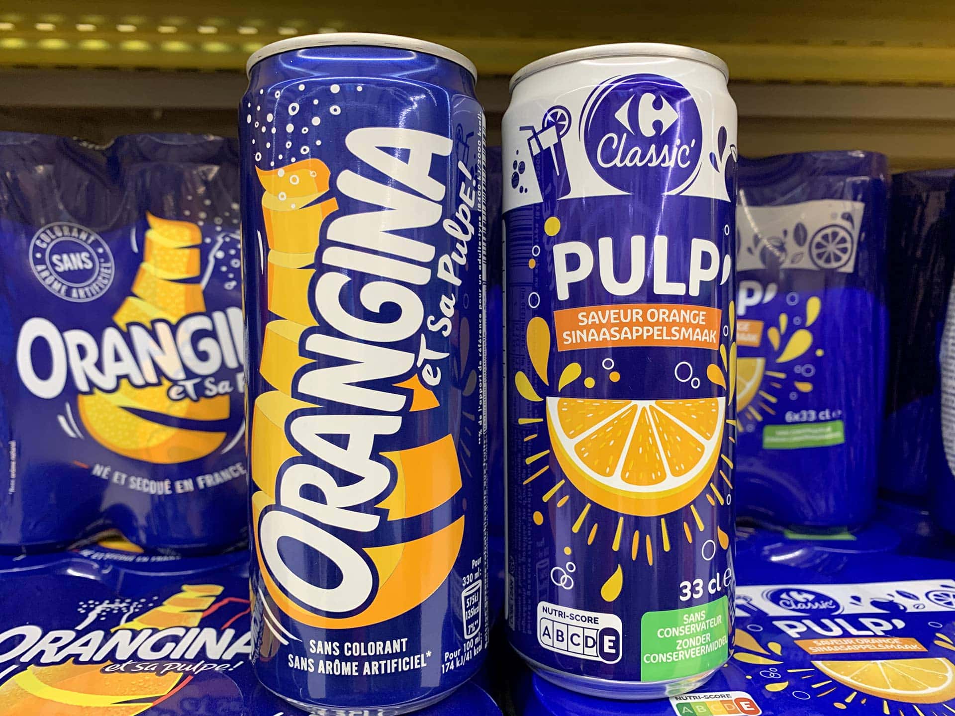 Ces derniers mois deux nouvelles enseignes ont franchi le pas. Lidl avec ses deux seules références conditionnées historiquement en canette : le cola et le tonic à sa marque Freeway. Carrefour, pour sa part, a opté pour la boissons aux fruits Tropical et le soda orange pulpé Pulp’, tous les deux arborant la signature Carrefour Classic. A noté qu’avec Pulp’, Carrefour s’est largement inspiré des codes de la marque leader Orangina : couleurs bleu, blanc et orange, et bien sûr, canette 33 cl slim !