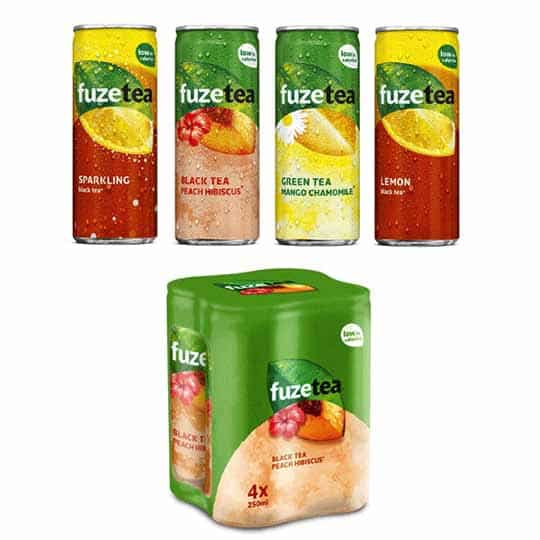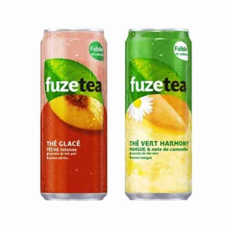 Privé de la marque de Nestlé, Coca-Cola a aussitôt rebondi en distribuant dans l’Hexagone sa signature internationale Fuze Tea. 4 parfums sont disponibles : Evasion (thé noir, hibiscus & pêche), Harmony (thé vert, camomille & mangue), Pêche Intense et Citron Intense. Si en grande distribution ces produits sont seulement proposés en PET 1,25 l, deux canettes slim 25 cl existent pour le hors domicile : Pêche Intense et Harmony. En Belgique, autre marché très consommateur de thés glacés, 4 références sont commercialisées en canettes dont une déclinaison pétillante de citron Intense. Après les deux premiers mois de lancement dans l’Hexagone, Fuze Tea peut s’enorgueillir d’avoir atteint 80 % de DN et une part de marché valeur de 4 % à P5. Avec 4 millions d’euros ainsi générés, la marque de thé de Coca-Cola est devenu sur la période le premier contributeur à la croissance du rayon soft-drinks en GMS. Dans le circuit hors-domicile, Fuze Tea est d’ores et déjà présent dans 23 000 établissements.