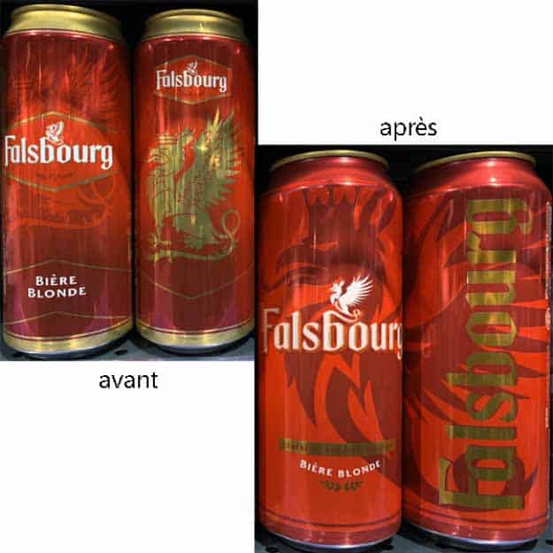 Il n’y a pas que les grandes marques nationales comme Kronenbourg qui régulièrement revoient leurs packagings. Les enseignes sont également très soucieuses de l’apparence de leurs produits maison, garante de la prise en main par les consommateurs. La bière blonde de luxe Falsbourg a fait l’objet d’une refonte assez subtile. Au verso de la canette, la marque s’inscrit désormais en vertical et au recto, la marque a été agrandie, gagnant ainsi en visibilité. Le griffon emblématique tapisse désormais entièrement l’arrière-plan de la boîte sur 360°. Enfin, au verso, comme précédemment sur sa nouvelle canette de soft-drink pulpé orange, Leclerc a apposé le logo « Métal recyclable à l’infini ».