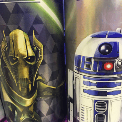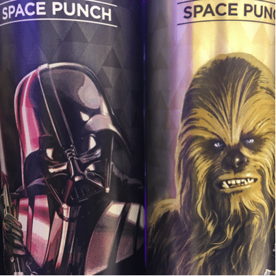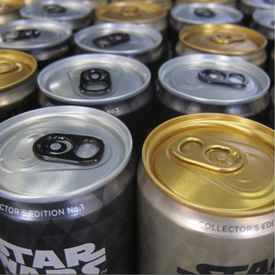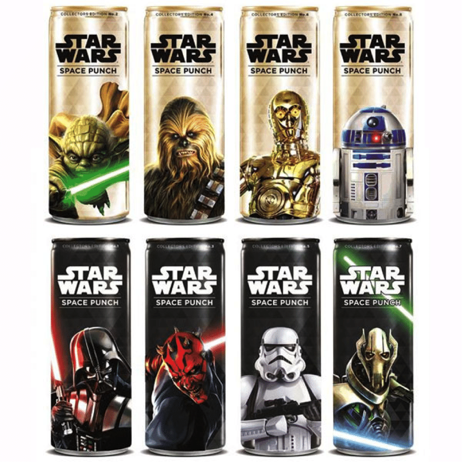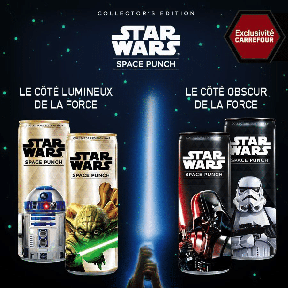 Pour conforter le côté collector de ses canettes, l’entreprise n’a pas lésiné et lancé une véritable série mettant en avant une dizaine de personnages de Star Wars. Aussi bien ceux du côté obscur de la force (fond noir), que ceux du côté lumineux (fond doré). La juxtaposition de ces boîtes en linéaires et du plus bel effet. Les détails des illustrations ont été particulièrement soigné à l’impression.