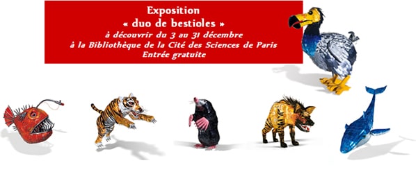 « Duo de Bestioles » est plus qu’une simple expo de sculptures animalières. En effet, elle propose un regard différent sur le monde animal basé sur la découverte des liens qui peuvent unir deux animaux entre eux. Des liens de natures très variés, relevant de la biodiversité (régime alimentaire, taille, habitat, etc.), de la langue française (expressions), de la poésie (fable de La Fontaine) ou autre…