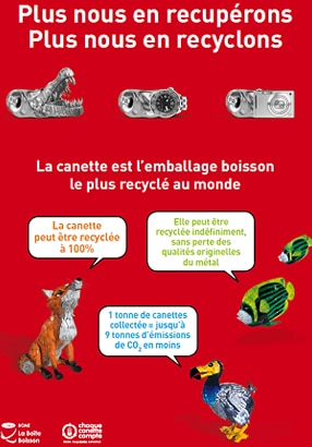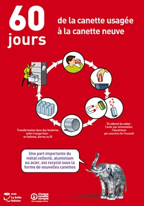 Qu’elle soit en acier ou en aluminium, la boîte boisson est 100 % recyclable à l’infini, sans que le métal ne perde jamais ses qualités originelles. En France, près de 2 canettes sur 3 sont aujourd’hui recyclées et les industriels sont mobilisés pour atteindre l’objectif des 75% d’emballages recyclés fixés par le Grenelle de l’Environnement. Des panneaux informatifs présenteront le cycle de vie de la canette aux visiteurs de l’exposition.