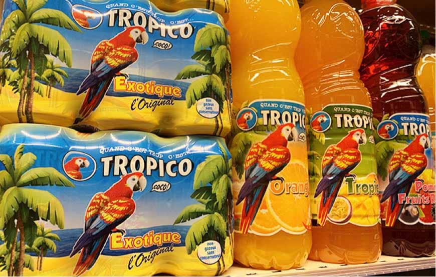 Outre le lancement de Coca-Cola Energy au rayon des Energy Drinks, le déploiement de Fuze Tea et le développement de Honest sur le segment des thés, l’industriel consolide sa position sur le segment des boissons aux fruits. En effet, il dispose désormais, aux côtés de Capri Sun, de Tropico, marque historique du rayon rachetée aux Cafés Folliet en septembre 2018. Si les précédents propriétaires avaient relancé Tropico pour atteindre 4 % du marché en volume, Coca-Cola entend bien doubler cette PDM dans les deux ans. La filiale du géant d’Atlanta a entrepris de réveiller la belle endormie avec tout d’abord un relifting. Plus modernes, les packagings conservent toutefois l’emblématique perroquet Coco. La gamme s’étend désormais à quatre parfums