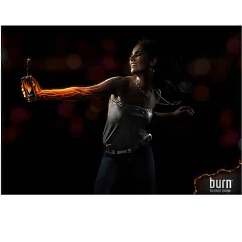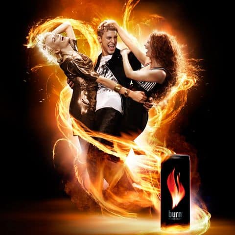 Autre marque d’energy drink, Burn de Coca-Cola tente de décrire à l’aide d’images dûment retouchées, la « décharge » énergétique que procure sa consommation (Royaume Uni).