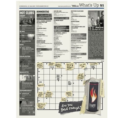 Dans un autre genre, en Suisse, Burn investit et revoie à sa façon certaines rubriques phares de la presse comme ici les mots croisées ou encore les petites annonces.