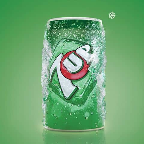 Montage photo très réussi également pour Seven Up, dont la canette retranscrit l’effervescence que produit la précipitation d’un glaçon dans un verre de limonade (Arabie Saoudite).