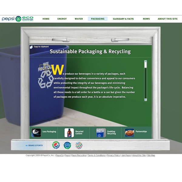 De son côté, le site Pepsi Eco Challenge permet aux consommateurs de suivre les impacts environnementaux des produits Pepsi sur les 3 éléments majeurs que sont l’énergie, l’eau et l’emballage au sens large du terme. De même, la marque y expose ses efforts mis en œuvre pour atteindre son objectif de réduction de 20 % des consommations d’électricité et d’eau et de 25 % des consommations d’énergie fossile d’ici 2015.