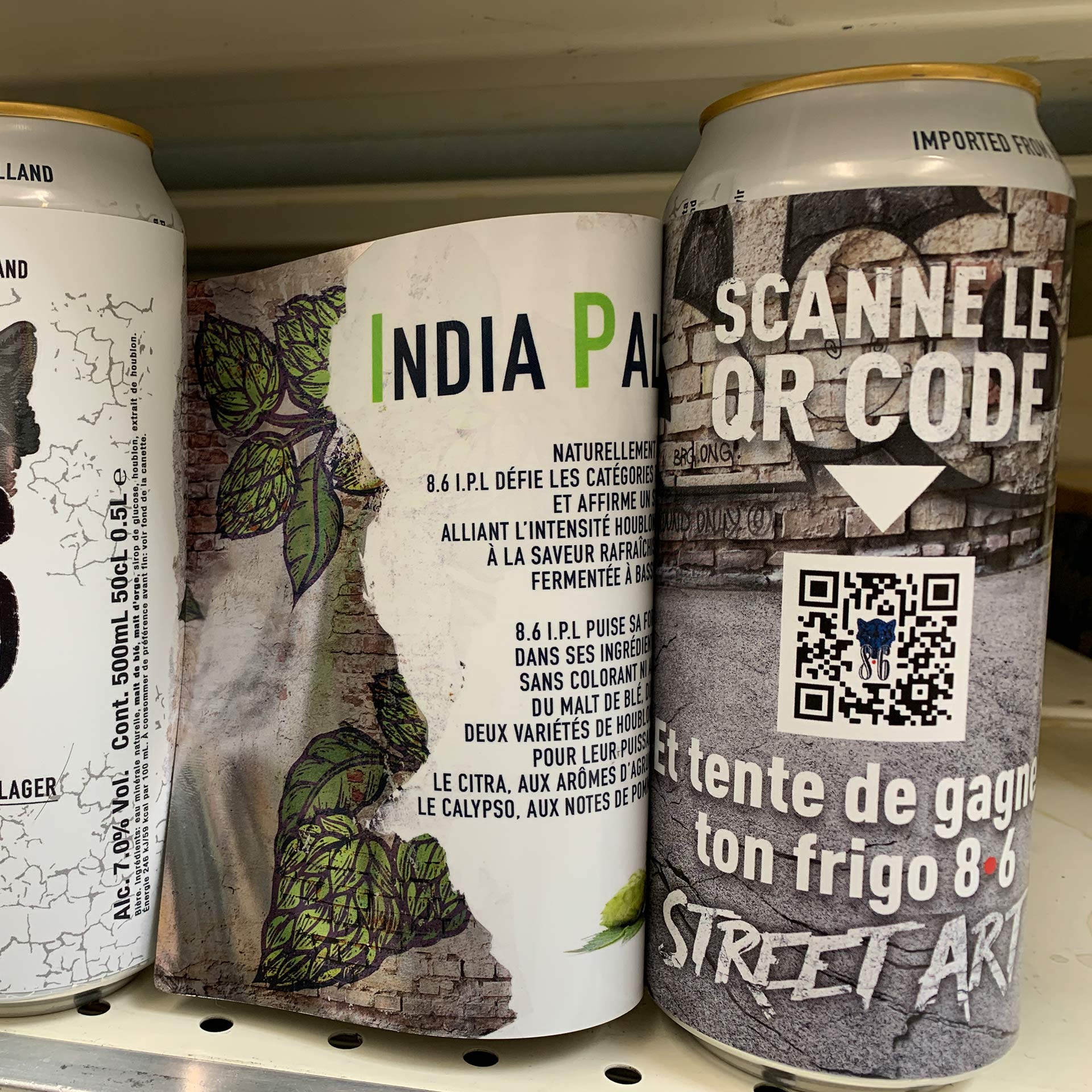 Le deuxième sticker, indissociable de la boîte, est réservé au côté ludique avec l’impression d’un QR-code permettant de participer à un jeu concours pour gagner un frigo 8.6 façon street art. Frigo justement représenté au dos de la canette, toujours sur ce deuxième sticker.