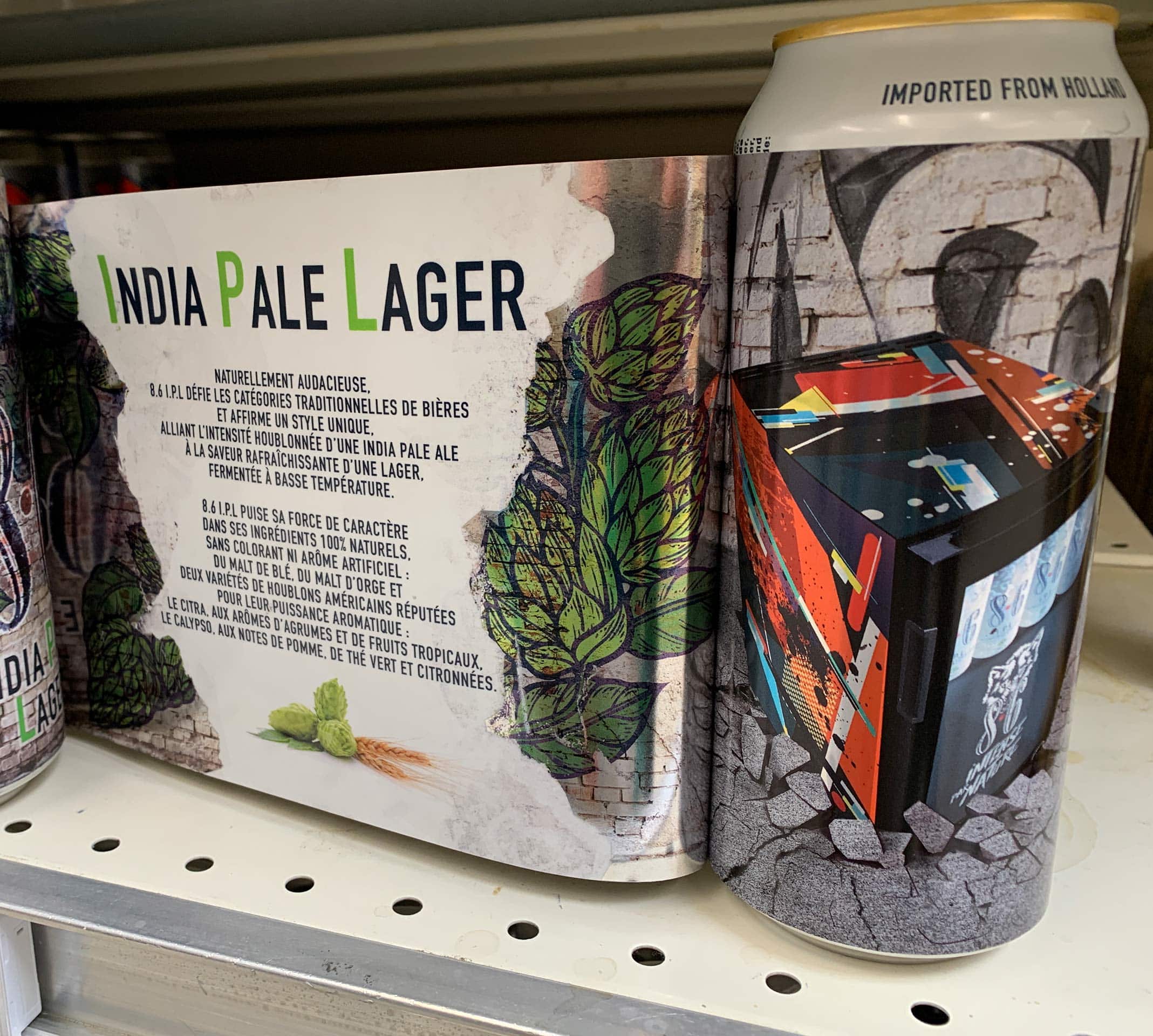 En 2022, Swinkels Family Brewers teste une nouvelle activation pour sa marque 8.6. En marge des 4 décors collectors pour la référence 8.6 Original (cf note) ), la 8.6 IPL pour India Pale Lager, apparue en 2018 (cf. note), est revêtue d’un sticker. Une manière d’arborer un décor événementiel (ici un fond de mur de brique avec des fleurs de houblon peintes façon street art) sans pour autant devoir réimprimer des boîtes. Le procédé va plus loin puisqu’il s’agit même de la superposition de deux stickers et donc deux décors. Le premier est décollable/repositionnable à la différence du second. Sur la face intérieure du premier sticker, outre la reprise du décor du mur/houblon, la marque prend le temps d’expliquer sa recette, ses ingrédients et particulièrement les différentes variétés de houblons utilisées. Une façon pour 8.6 d’apporter de l’eau au moulin des consommateurs un peu décontenancés devant la signature IPL noyée dans un univers d’IPA. Un discours assez long qui ne tiendrait pas sur la seule surface imprimable de la boîte… pourtant réputée étendue.