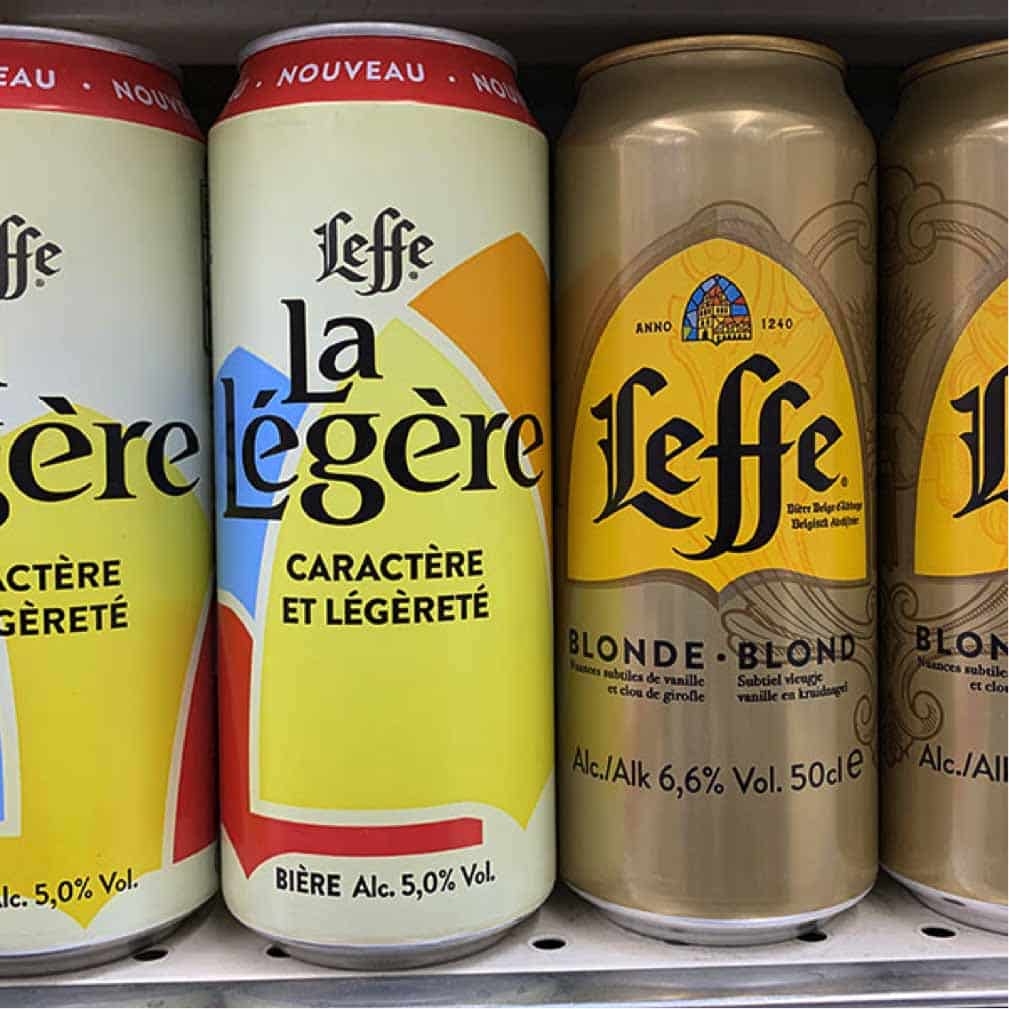 Leffe aligne désormais en France une gamme de 14 recettes avec l’arrivée récente de La Légère et de la 0,0 % . En boîte pour l’heure 8 références sont commercialisées en format 50 cl (Blonde, Brune, Ambrée, Ruby, Légère), 44 cl (Triple et Radieuse) et 33 cl (0,0 %).