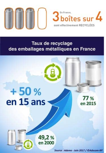 D’après le dernier rapport de l’Ademe de juin 2017 sur la valorisation des emballages en France (chiffres 2015), 77% des emballages métalliques sont recyclés. Un chiffre en hausse de +50% en 15 ans (2000-2015) grâce aux efforts de tous les acteurs de la filière. Aussi, contrairement aux chiffres actuellement en circulation et mal interprétés, les emballages métalliques affichent un très bon taux de recyclage.
