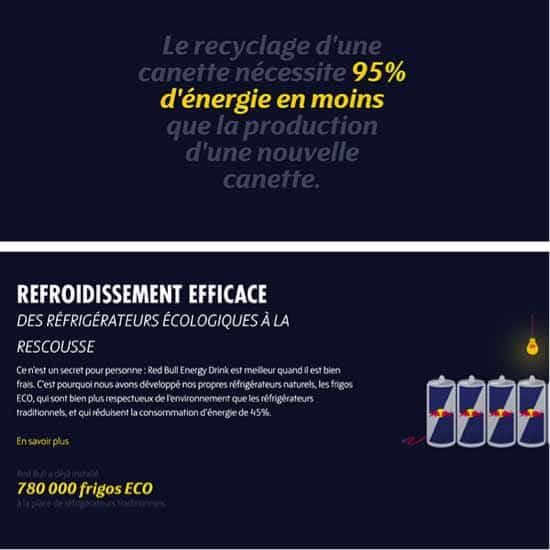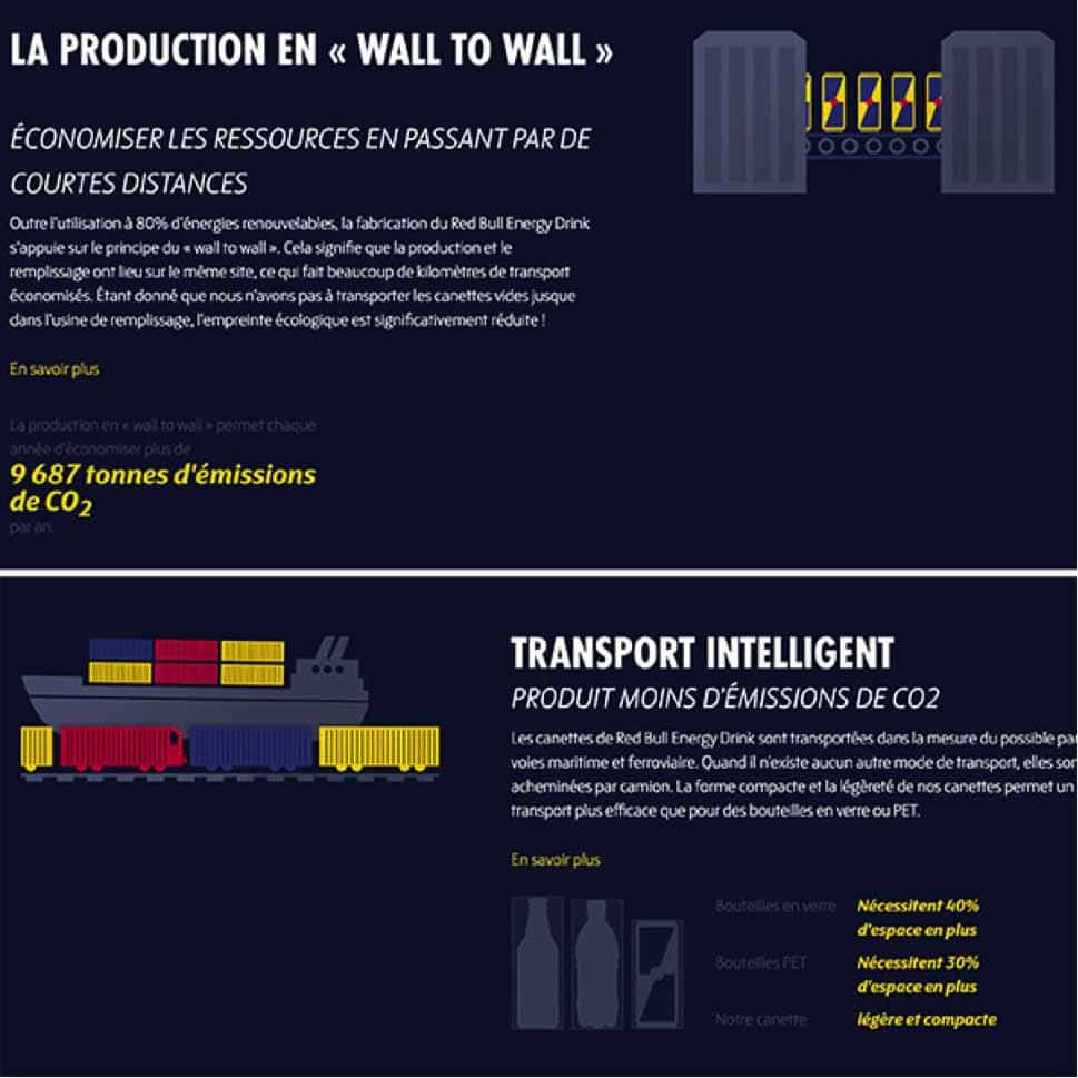 Viennent ensuite toute une série chiffres clés (« Le recyclage d’une canette nécessite 95% d’énergie en moins que la production d’une nouvelle canette »), ainsi que des infographies mettant en exergue quelques faits saillant. Ainsi Red Bull explique le principe du « wall to wall » régissant sa production. « Cela signifie que la production et le remplissage ont lieu sur le même site, ce qui fait beaucoup de kilomètres de transport économisés. Étant donné que nous n’avons pas à transporter les canettes vides jusque dans l’usine de remplissage, l’empreinte écologique est significativement réduite ! »