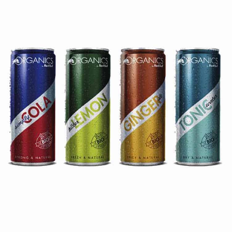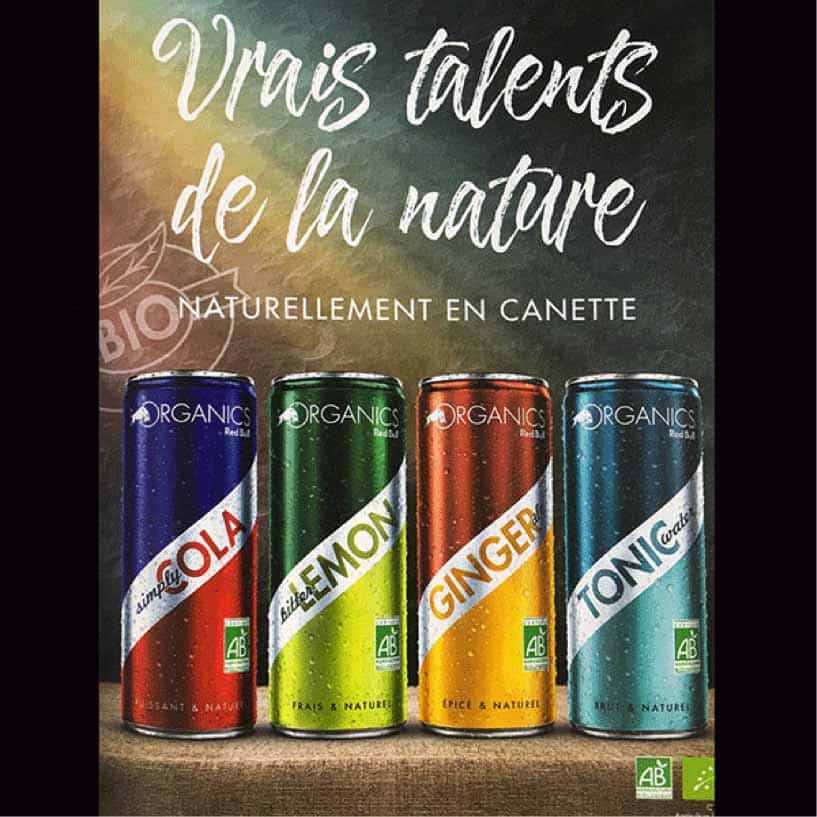 Exception faite du cola (simply cola), des boissons plus courantes dans les pays anglo-saxons qu’en France, plus habituelles sous une marque comme Schweppes : un bitter lemon, un ginger ale et un tonic water. Pour l’occasion, Red Bull a initié une nouvelle signature Organics Red Bull, avec l’emblématique taureau incrusté dans le O. Outre la présence sur les packagings du logo AB et de la « feuille » européenne désignant les produits bio, Red Bull insiste sur le terme « naturel ». Ainsi le cola est désigné par « Puissant & Naturel », le bitter lemon par « Frais & Naturel », le ginger ale par « Epicé & Naturel » et le tonic water par « Brut & Naturel ». De même la communication presse fait apparaître le slogan « Vrais talents de la nature » et la base-line « naturellement en canette ». Une façon de rappeler qu’il est tout naturel pour un produit Red Bull d’être conditionné en canette, mais également de suggérer le caractère recyclable et vertueux de cet emballage.