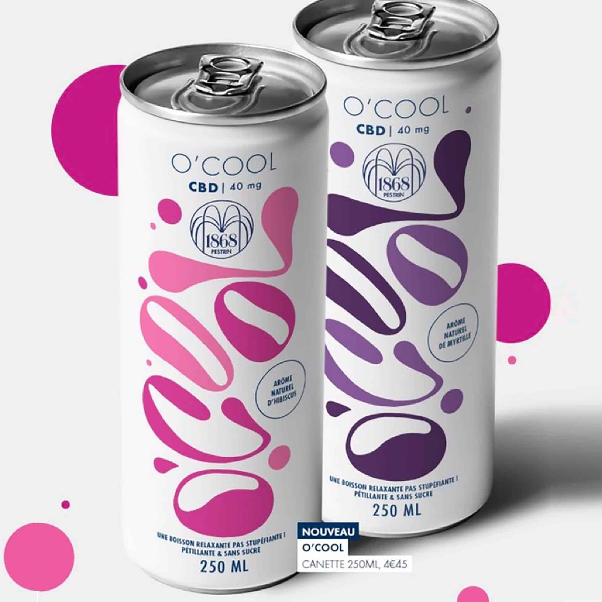 Quant à O’Cool, la marque est le fruit de société Sources du Pestrin. Deux recettes sont proposées, saveur myrtille et saveur hibiscus, à base d’eau minérale gazeuse Ventadour dans laquelle ont été infusés 40 mg de CBD. Au bas des canettes 25 cl slim il est mentionné : “une boisson relaxante, pas stupéfiante, pétillante et sans sucre“.
