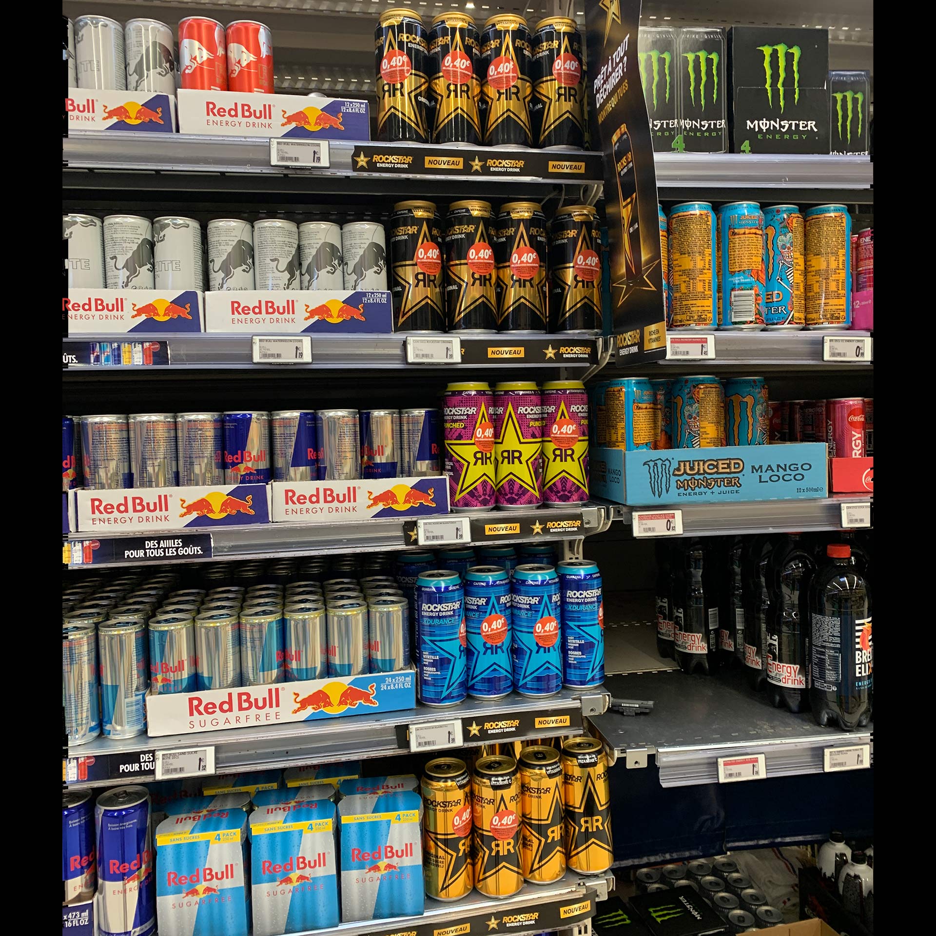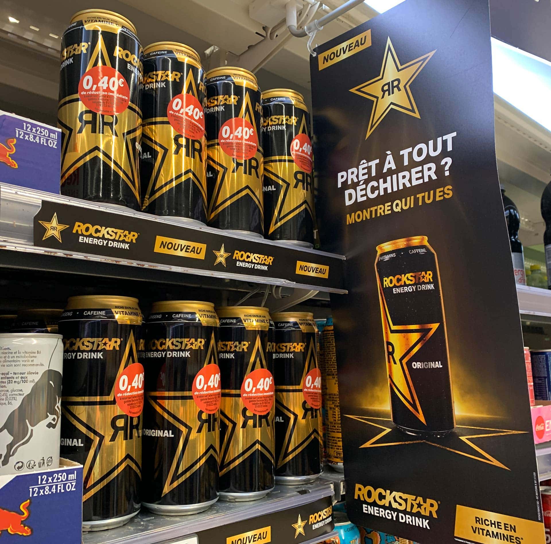 Pour ce faire, la marque ne lésine pas sur ses efforts marketing et commerciaux. Rockstar s’associe à de nombreux évènements dans l’univers du gaming et du e-sport. Par ailleurs, la marque joue à fond l’agressivité tarifaire en rayon n’hésitant pas à apposer des bons de réduction immédiate sur ses canettes vendues à l’unité d’un montant de 40cts, abaissant ainsi le prix de la boîte 50 cl juste sous le seuil des 1€. Il faut dire qu’avec un prix moyen (source drive A3 Distrib) de 1,27€ pour la référence Origina, Rockstar n’est pas aussi compétitif que son grand rival Monster (Coca-cola) vendu en moyenne 1,13€.